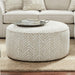 SALTNEY Ottoman, 39"L X 39"W X 18"H, 32lbs. It's everything an Ottoman should be - broad, round, firm and soft - perfect for use in any room. The two-tone artful array of arrowhead / feather-like imprints boasts a pleasant contrast. Singular cord welt trim circles the buoyant and comfortable surface, a favorite for casual sitting or leg-resting. Easy portability satisfies a variety of demands and uses.